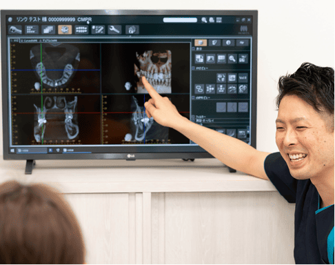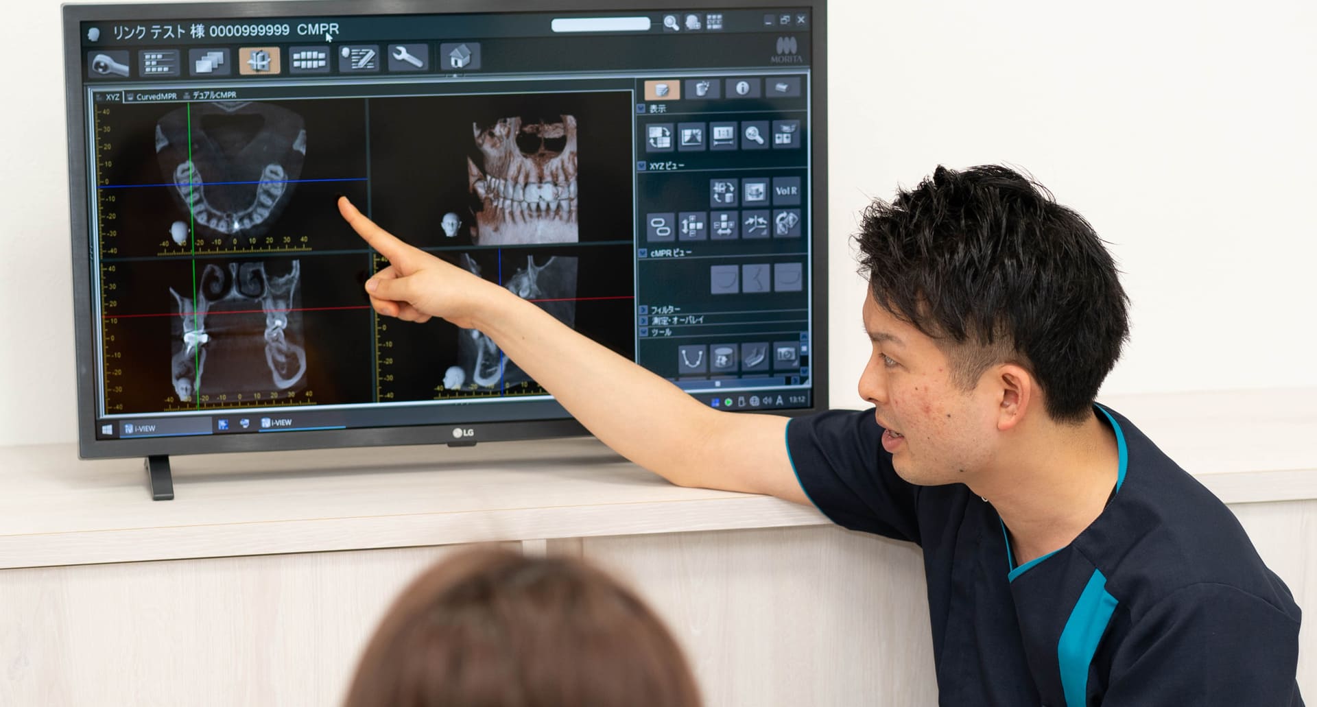 患者さんのお口の状態と治療計画をご説明します。治療内容に選択肢がある場合は、それぞれのメリットやデメリットもお伝えしますので、今後の治療を一緒に考えていきましょう。お口の中の環境が良くない場合は、先に治療を済ませる場合があります。