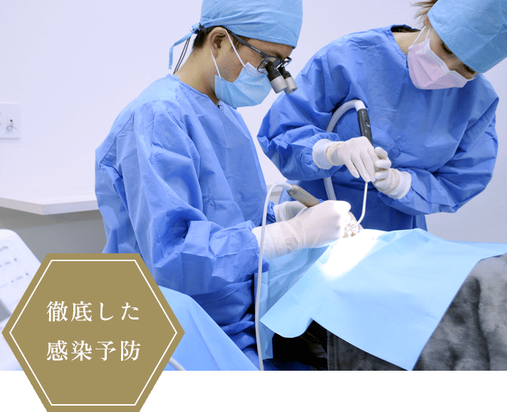 感染予防は、インプラント治療を成功させるうえで重要なポイントです。万が一、手術中に感染を引き起こしてしまった場合、骨とインプラントはうまく結合しないことがあります。このような感染リスクを軽減するため、感染予防に徹底的に配慮した専用のインプラントオペ室をご用意していますご安心いただければと思います。